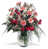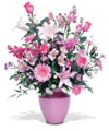 Powerful pink Snapdragons, Lilies, Carnations, Roses, Gerbera Daisies, Alstroemeria and more in a pink vase. Just the right touch.